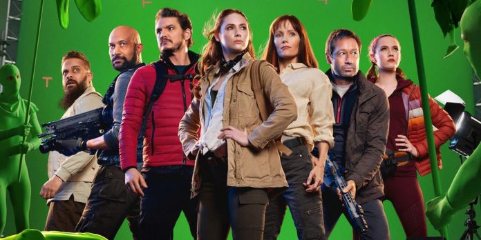 Talvez a maior vergonha do filme sejam os atores, existem muitos talentos aqui: Karen Gillian (talvez a melhor do filme), Maria Bakalova (totalmente mal aproveitada), Pedro Pascal (personagem lamentável durante todo o filme), Leslie Mann (vergonha alheia), David Duchovny (provavelmente com boletos para pagar), e muitos outros. É um mal aproveitamento de tantas figuras carismáticas, que acaba virando uma gigante vergonha alheia. Os atores precisam gravar mais um capítulo da franquia de dinossauros desse universo, uma sátira para as infinitas continuações de Hollywood, mas incrivelmente A Bolha consegue ser pior que o filme fictício. Tudo é jogado e extremamente indiferente, não tem nenhum talento para se aproximar do humor ácido.