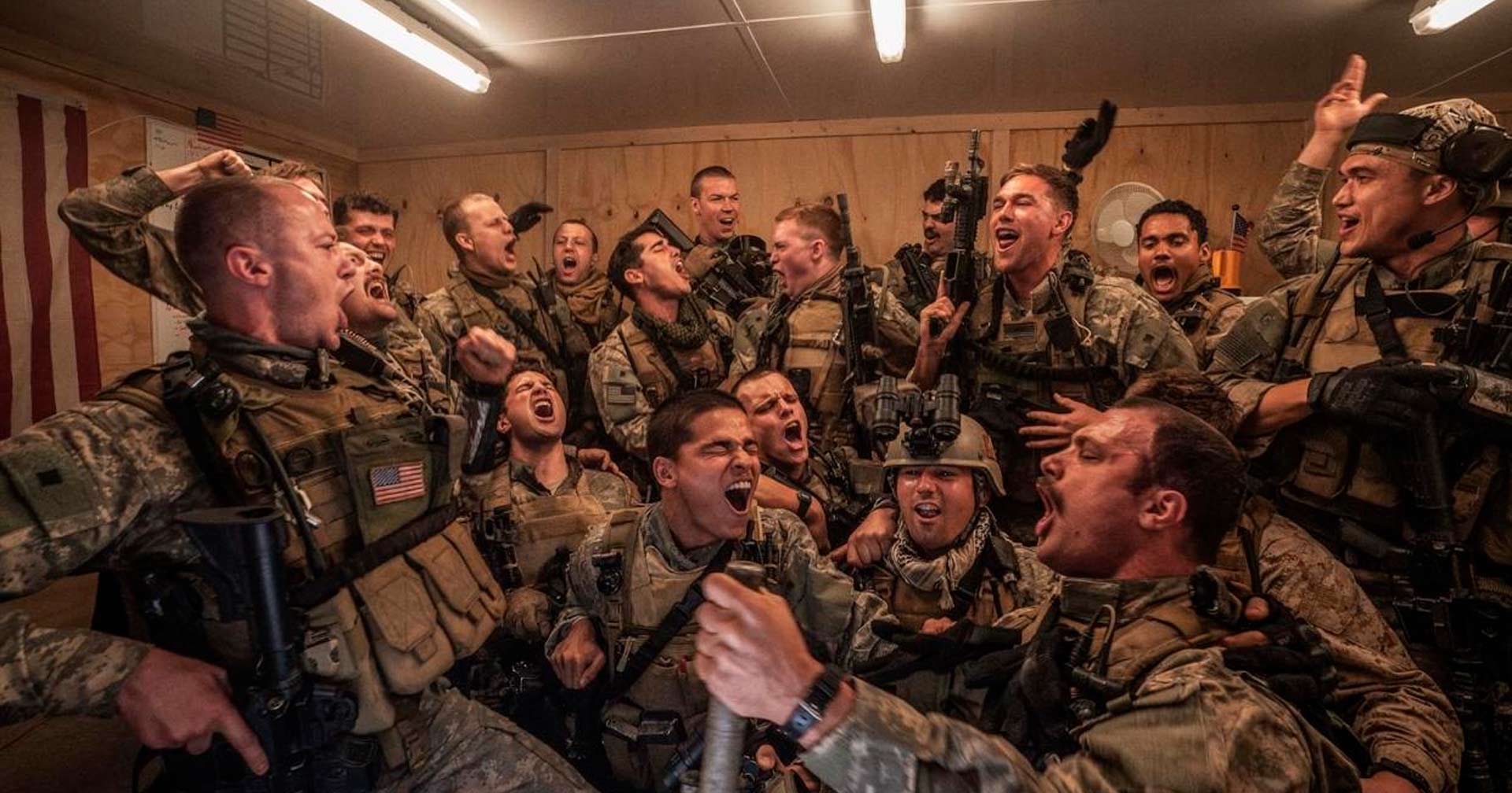 Há uma ousadia louvável no quesito de reproduzir vivências traumáticas de guerra a partir das memórias, a ponto de fazer o espectador sentir e tomar as dores dos personagens em cena de maneira mais intensa do que contemplar a arte cinematográfica a ser reproduzida. Tempo de Guerra se inicia mostrando um breve momento de descontração do jovem pelotão que passou pelo bárbaro episódio em Ramadi, que destaca uma juventude cumpridora de ordens, mas que ainda era composta, em sua maioria, por rapazes típicos da segunda metade dos anos 2000. Apesar de não aprofundar em apresentações ou dramas pessoais, o que não é um objetivo do longa-metragem (mas, ainda assim, agregaria um alto valor sentimental ao filme e também contribuiria para o drama sensorial nos momentos que viriam a seguir), somos imersos nas estratégias de combate e defesa dos personagens, ainda mais quando sentimos o tédio e a calmaria que vêm atrelados a tensão silenciosa nas cenas de observação e aguardo do ataque das tropas inimigas. Mesmo que o filme não tenha um storytelling bem definido, é possível ao menos separar os momentos de iniciais de silêncio e preparo para o confronto, bem construído a partir de planos fechados, ausência de trilha sonora e enquadramentos que tornam o apartamento invadido pelas tropas americanas para esconderijo um ambiente claustrofóbico e vulnerável.