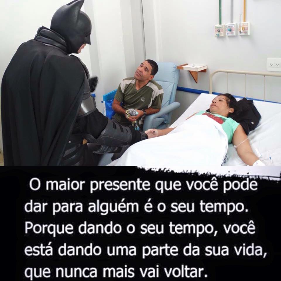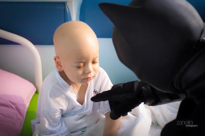 CZ : Então, tudo isso começou pela promessa que fiz ao meu pai. Ele teve câncer e passou pelo que chamam de Os 5 estágios da doença : A negação, a raiva, a barganha (onde as promessas são feitas), a depressão e a aceitação. Percebi que tudo que eu tentava como motivação não dava certo, até que tentei outra forma e funcionou. Aí prometi que iria parar de entrar em hospitais vestido de palhaço e iria como Batman, mas exatamente em pontos onde crianças e adultos estivessem em depressão. Foram 2 anos tentando entrar em hospitais de forma normal e tendo que entrar escondido. Até que uma mãe me procurou desesperada, com o filho na oncologia. Ela estava tão nervosa que falava comigo como se eu realmente fosse o Batman. O filho dela estava em depressão, não comia mais, não falava e estava recusando a quimioterapia. Ele seria mandado para casa, pois o medicamento não pode ser forçado. Eu teria que ser rápido, não teria tempo de entrar escondido e me vestir, porque iria demorar muito. Fui direto, com a roupa, de moto e entrei, mesmo sabendo que isso me prejudicaria em outras visitas. Mas era o que tinha que ser feito.