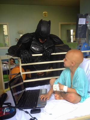 Conversei com a mãe, pedi que ela voltasse ao quarto e sem saber o que fazer, fechei meus olhos e imaginei o que o Batman faria. Chutei a porta do quarto para chamar a atenção do garoto e entrei. Ele me olhou sério e perguntou a mãe se ela tinha chamado o Batman. Ela emocionada por ouvir a voz do filho depois de algum tempo de silêncio, disse que sim, pois ele não comia mais e não queria fazer quimioterapia. Conversei um pouco com ele, mas logo chegou um enfermeiro grande, daqueles que são chamados para segurar pessoas fortes nas macas. Ele estava muito alterado. Tive que pensar rápido e partir para o emocional. Perguntei ao garoto se ele sabia quem era aquele cara ( apontando para o enfermeiro). O garoto disse que não e eu falei que era o Lanterna Verde. O enfermeiro abriu um sorriso e eu disse que estávamos ali para colher o sangue dele para levar para a Liga da Justiça, mas que iria doer e ele teria que ser forte. Me retirei do quarto e fui embora. No outro dia recebi a ligação da Drª Juliana, chefe da Oncologia dizendo que tinha dado resultado e me liberando para entrar sempre que fosse preciso. Agora é assim em todos hospitais.