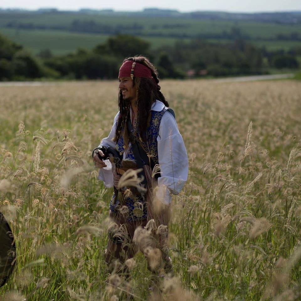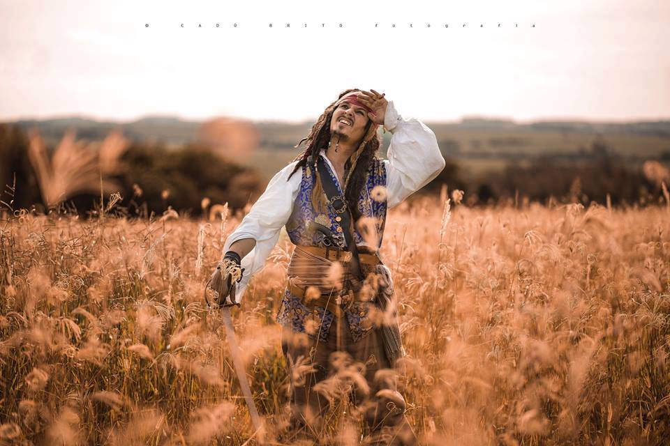 L.P. : Olá pessoal, então… tudo começou aproximadamente no ano de 2006 ou 2007 onde algumas amigas me chamavam de Willy Wonka, comentavam uma semelhança com o personagem vivido pelo Johnny Depp no remake da Fantástica Fábrica de Chocolates. Depois disso no ano de 2008 no carnaval de bonecos gigantes em São José dos Pinhais/ PR, produzimos o boneco do Capitão Jack Sparrow e eu fui o responsável pela manipulação dele. Nesse meio tempo uma amiga que usava dreads cortou e eu pedi pra ficar com eles, costurei numa bandana vermelha e voilà…o Capitão Jack Sparrow começou a tomar forma, mas comecei pra valer em 2010.