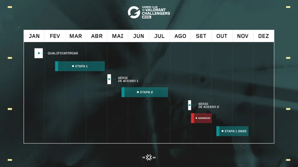 O Gamers Club VALORANT Challengers Brazil acontecerá entre os meses de fevereiro e novembro com duas Etapas em formato de liga, referente à temporada de 2024, e uma etapa em formato de copa, no final do ano, referente à temporada de 2025 – com mais detalhes a serem anunciados posteriormente. Portanto, o calendário do ano será mais extenso, se comparado ao atual.