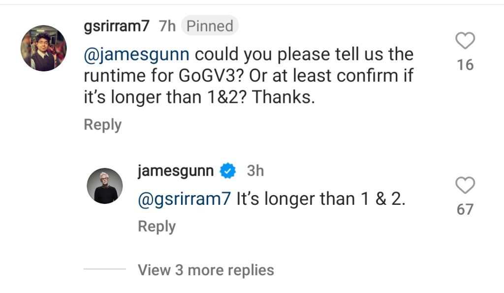 Ao ser questionado sobre a duração de Guardiões da Gaáxia Vol. 3 em seu Instagram, o diretor James Gunn confirmou que o novo capítulo da franquia será mais longo que os anteriores, mas não deu detalhes exatos sobre a metragem do filme.